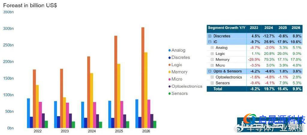 其中,逻辑半导体市场规模增长 7%、存储半导体则增长 20%、传感器增长 16%、模拟和微型器件均小幅增长 4%,而分立器件和光电器件分别出现 4% 和 0.5% 的环比下滑。